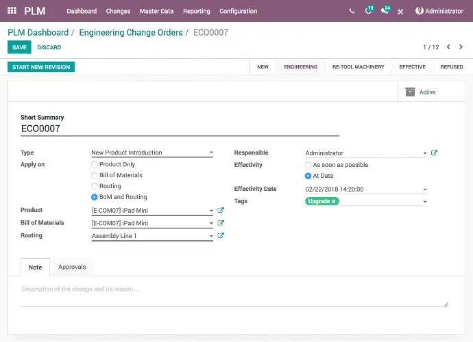 La aplicación PLM (Gestión del ciclo de vida del producto) de Odoo es un control de versiones colaborativo durante y después de la producción.