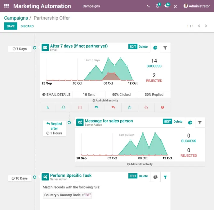 Usa la aplicación CRM de Odoo, califica tus leads por criterios demográficos y de comportamiento, luego asígnale los mejores a tus equipos de ventas.