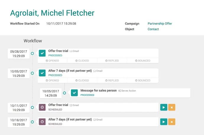 Crea recorridos del cliente bastante completos y utiliza flujos de trabajo para automatizar tareas, como mover un lead en tu flujo de ventas, asignar clientes potenciales comprometidos a tu equipo de ventas, actualizar un registro y muchas acciones más.