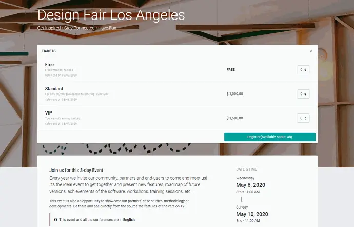 La aplicación Eventos de Odoo cubre todas las actividades de un planeador de eventos como la organización de eventos, la venta de boletos y su visibilidad y promoción.