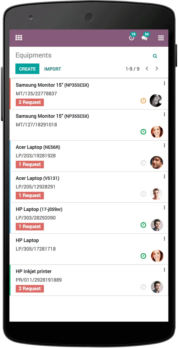 para que tus procesos sigan en funcionamiento Odoo calcula las estadísticas estándar para ayudarte en el mantenimiento preventivo, por ejemplo, el tiempo medio entre fallos (MTBF), el tiempo medio de reparación (MTTR) y la fecha prevista del próximo fallo.