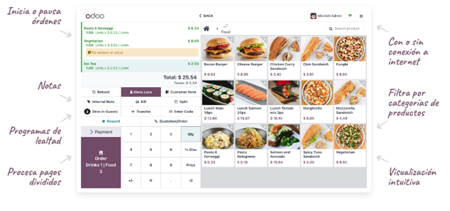 Odoo TPV ofrece una interfaz intuitiva que permite a tu equipo iniciar o pausar órdenes, añadir notas, gestionar programas de lealtad, y procesar pagos divididos, todo desde una sola plataforma.